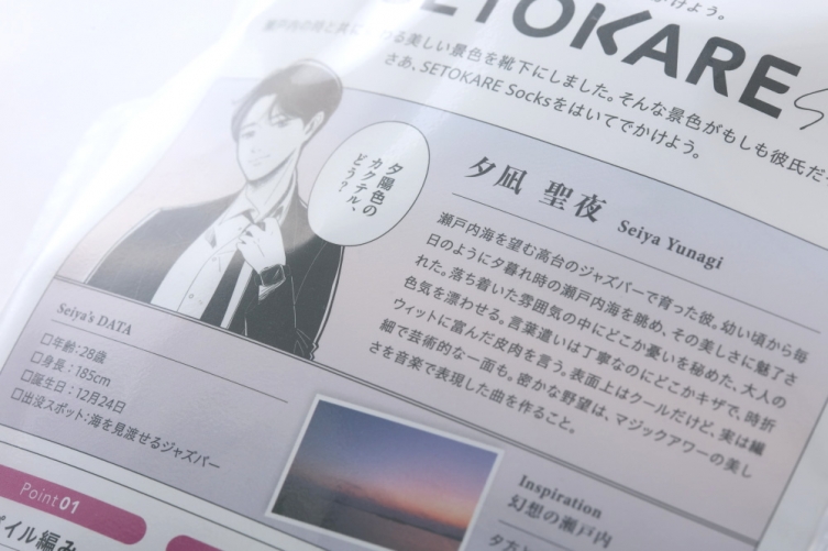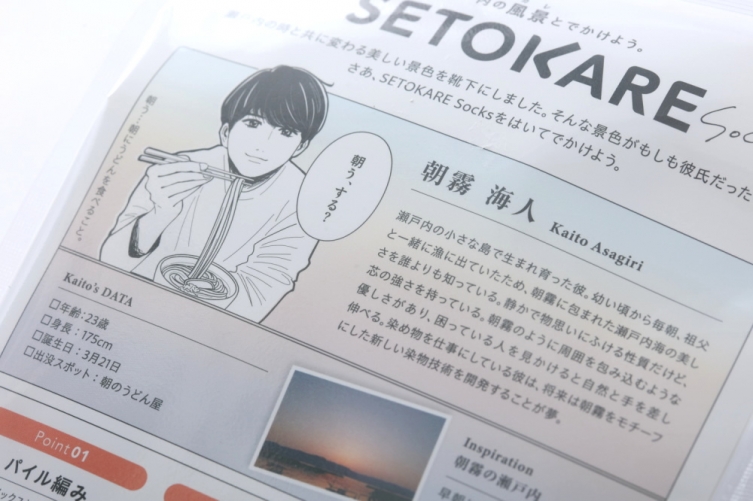 SETOKARE Socksは、higotoならではの女性視点で、「もしもその景色が彼氏だったら...?」という遊び心あるコンセプトを考案。それぞれの景色にキャラクターを設定し、まるで瀬戸内の風景(カレ)と旅をするような新しい体験を提供いたします。